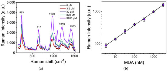 (a) SERS spectra of TBA-MDA derivative for MDA concentrations ranging from 0 to 3200 nM. (b) Calibration curve of MDA. Each point corresponds to measurements received from 5 substrates (3 different spots per substrate) ± SD.