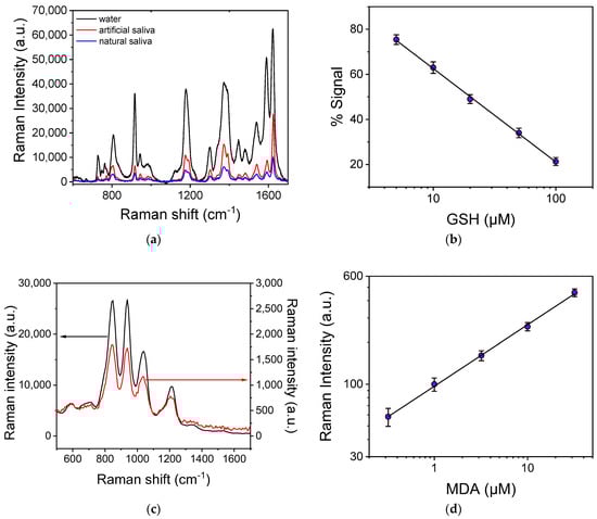 Based on the results obtained for the determination of GSH and MDA in water, the next step was their detection in artificial and natural saliva. In Figure 7a, the SERS spectra obtained from surfaces modified with CV and then reacted with a zero-GSH calibrator prepared in water or artificial saliva, as well as with a natural saliva sample, are depicted. As shown, the Raman intensity decreased by approximately five times when the GSH solution was prepared in artificial saliva instead of distilled water. The signal reduction may be attributed in the presence of inorganic compounds containing sulfur (KSCN, Na2SO4) in the artificial saliva that could react with the substrate replacing CV molecules [59,60,61]. Despite this considerable signal reduction, there was a concentration-related response when the surfaces were reacted with GSH calibrators with concentrations ranging from 5 to 100 μM prepared in artificial saliva (Figure 7b), resulting in a detection limit of 2.0 μΜ. From the calibration curve depicted in Figure 7b, a GSH concentration of 20 μΜ was calculated for the natural saliva sample. This result can be attributed to two sources, the saliva endogenous GSH and additional effects from other compounds present in the real saliva sample but not included in the artificial saliva’s composition [48,57,62]. In particular, due to the detection principle employed, it is expected that small organic molecules containing N and/or S-like amino acids might interfere; however, it has been demonstrated that amino acids which do not contain S do not affect the signal, whereas the presence of amino acids containing S (methionine, cystine, oxidized glutathione) and even amino acids with free thiol groups such as cysteine and N-acetylcysteine marginally increase the signal (~10%) at concentrations much higher than those expected in biological fluids [51]. This is due to the fact that the GSH has a higher binding affinity toward Ag as compared to other compounds. However, the effect of other factors and especially of the way the sample has been collected and treated needs to be examined in great detail using saliva samples from different donors to conclude on the matrix effect in the method developed.