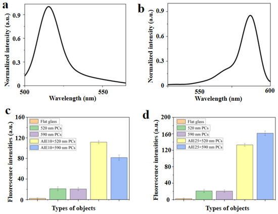 Both AIE10 (Tetraphenyl ethylene-Br) and AIE25 (Tetraphenyl ethylene-NH2) are substances with aggregation-induced emissions. The chemical structures of AIE10 and AIE25 are shown in Figure 2d. Different fluorescent substances have their own particular maximum fluorescence emission wavelength. Figure 3a shows that AIE10 is excited by 365 nm light, and emits at a wavelength of 515 nm. Figure 3b shows that AIE25 is excited by 470 nm light, and emits at a wavelength of 580 nm. The higher the overlap between the maximum reflection peak of the PCs and the maximum fluorescence emission wavelength of the luminous source, the stronger the resulting fluorescence enhancement effect [28]. To verify the fluorescence enhancement efficiency of AIEgens, we repeated the testing of the fluorescence intensities of 520 nm PCs and 590 nm PCs in the absence of AIEgens and 520 nm PCs and 590 nm PCs when AIE10 and AIE25 were used as fluorescent substrates (AIE10 was excited with 365 nm light and AIE25 was excited with 470 nm light), respectively. By comparing these data with the fluorescence intensity of glass sheets, we found that when AIE10 was combined with 520 nm PCs, the fluorescence enhancement effect was the largest, which was four times that at 520 nm PCs in the absence of AIEgens. The enhanced effect is shown in Figure 3c. When AIE25 was combined with 590 nm PCs, the fluorescence enhancement was the largest, which was seven times that of 590 nm PCs in the absence of AIEgens. The enhanced effect is shown in Figure 3d.