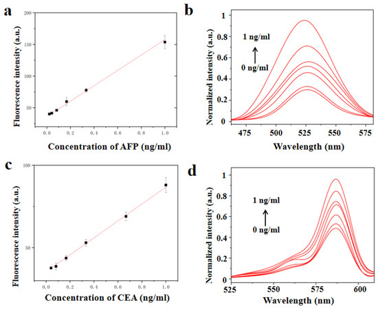 Herein, we chose AFP and CEA as typical multiple combinations of tumor markers for detection. Figure 4a shows the standard curve for an AFP bioassay based on AIE10-doped 520 nm PCs. The fluorescence intensity of AIEgens-doped PCs was determined by analyzing routine samples of AFP and CEA at concentrations ranging from 10 μg/mL to 1 ng/mL and plotted as a dose-response curves. Figure 4b shows the change of signal response with CEA concentration. The fluorescence intensity of the detection reservoir increased with the increase in AFP concentration. A good linear relationship between the fluorescence intensity and AFP concentration was observed within the detection range of 0.0416–1 ng/mL. The LOD, which was calculated as three times the standard deviation of the testing results of the blank divided by the slope of the calibration curve, was 0.0377 ng/mL. Figure 4c shows the standard curve of CEA bioassay based on AIE25-doped 590 nm PCs. The fluorescence intensity of the detection reservoir increased with the increase of CEA concentration [30]. In the detection range of 0.0416–1 ng/mL, a good linear relationship between fluorescence intensity and CEA concentration was observed, and the detection limit of CEA was 0.0337 ng/mL. Figure 4d shows the change of signal response with CEA concentration. The cut-off values of AFP and CEA in routine hospital clinical diagnosis range from 5 ng/mL to 8 ng/mL [22]. Therefore, our method is sufficient for practical application within the detection range.