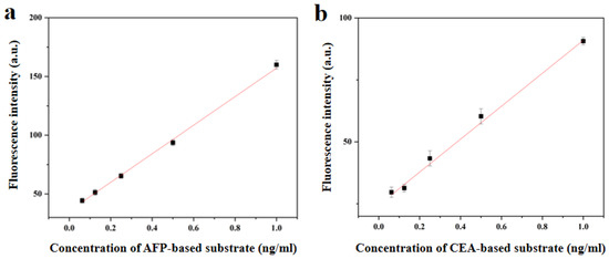 Fluorescence intensity function of (a) AFP mixed with a small amount of CEA and other interfering substances (b) CEA mixed with a small amount of AFP and other interfering substances drops with different concentrations on photonic crystals. The error line represents the standard deviation of the three repeated measurements.