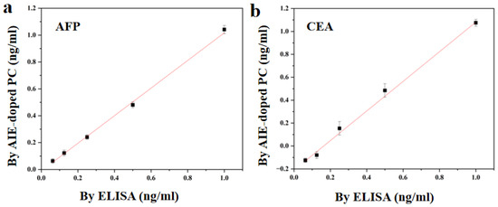 Correlation between multiplex bioassay based on AIEgens-doped PCs and ELISA for the determination of (a) AFP and (b) CEA in pbs samples. Any sample was repeated three times. The error line represents the standard deviation.