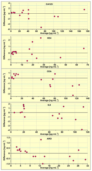Concentrations of CA125, HE4, CEA, IL-6 and aromatase in 15 real samples of serum were determined using the multiple biosensor and simultaneously using the single biosensors. The results are compared using Bland–Altman plots. This tool is used for the identification of potential differences between the results from two methods, that is, those obtained with the multiple biosensor and those obtained with single biosensors, used in separate experiments. For each sample, the difference between the result obtained with the multiple biosensor and that obtained with a single biosensor is calculated. This difference (Y-axis) is plotted against the average of those results (X-axis). The results are shown in Figure 2, for each biosensor separately. Dashed lines show the values of the SD of the difference. The majority of the results are located within the ±SD range, showing that the results obtained with the multiple biosensor are in principle the same as those obtained with the single biosensors, the degree of this agreement is different for various biosensors. In the case of the biosensor for the CA125 determination, only one of the 14 results is located above the SD, while in the cases of CEA and aromatase, three out of 15 results lie beyond the SD.
