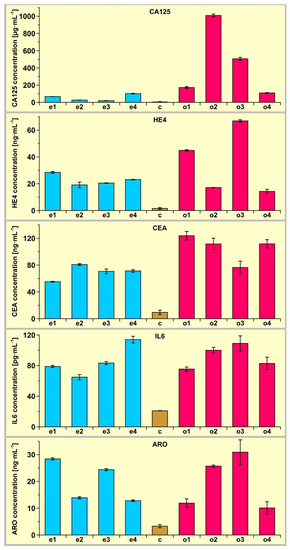 Results of CA125, HE4, CEA, Il-6 and aromatase determination in the plasma of four patients with endometrial cysts (samples e1, e2, e3 and e4) and four patients with ovarian cancer (samples o1, o2, o3 and o4) determined using the multiple biosensor. The average of four control samples (c) is also included.