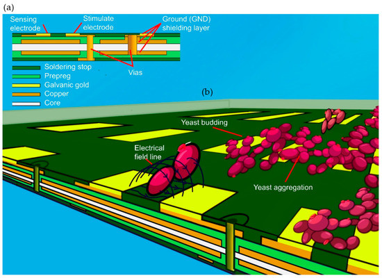 The MEA with 8 × 8 coplanar electrode pairs was realized based on a commercial low-cost PCB four-layer technology (Multi Leiterplatten GmbH, Brunnthal, Germany) with layers for shielding, interconnection, and electrodes as illustrated in Figure 2.