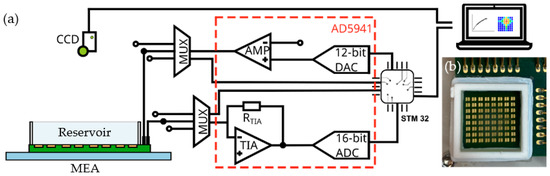 (a) Schematic illustration of the experimental setup with impedance readout circuitry connected to the MEA forming the bottom of a liquid reservoir. (b) Photograph of 8 × 8 microelectrode array (16 mm × 17 mm) with 3D printed reservoir walls.