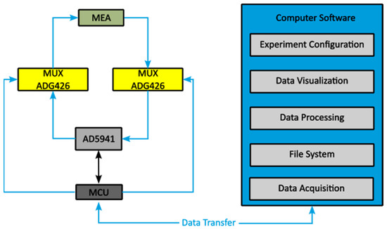 Function block diagram of the impedance measurement platform. The electrode array (MEA) was connected via two multiplexers (ADG426). The microcontroller (STM32H743) controlled data acquisition and activated stimulus signals from the impedance front end (AD5941). Different functional blocks including data processing and visualization routines were integrated in the home-made software which communicates with the microcontroller.