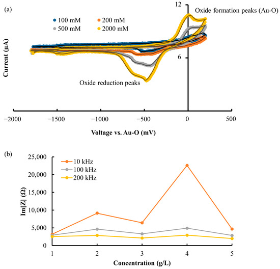 (a) The CV curves at varied salt concentrations (no sugar added). The Au-O oxide formation is set as reference (zero point of voltage scale). Electrochemical activity even for higher concentrations is only observed above −1000 mV and below −300 mV vs. Au-O, which indicates a window in which undesirable electrochemical processes can be avoided. (b) Im[Z] at frequency of 10 kHz, 100 kHz, and 200 kHz measured at voltage of −1000 mV vs. Au-O for varied sugar concentrations (no salt added), which shows that measurements at higher frequency can avoid undesired influences from sugar.