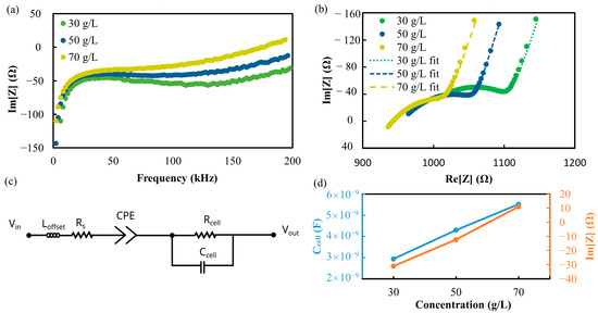 In a third step, impedance spectra of different yeast concentrations within 1 g/L sugar solution in normal water, 30 g/L, 50 g/L, and 70 g/L were recorded as shown in Figure 6a. The differences are more pronounced at higher frequencies, in accordance with the expected onset of β-dispersion. To obtain equivalent circuit parameters, the data were plotted as Nyquist diagrams in Figure 6b and fitted by ZView (Scribner Associates Inc.). As sketched in Figure 6c, an equivalent circuit was assumed including a solution resistance (Rs), a constant–phase-element (CPE) representing the double layer on the electrodes, a resistor (Rcell) connected in parallel with a capacitor (Ccell), and a small inductive contribution from the measuring electronics (Loffset) which caused the shift in the Nyquist diagram. Rcell‖Ccell represented the contribution of the cells.