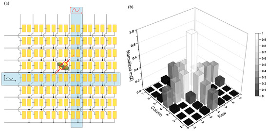 Schematic illustration of the row/column addressing in the MEA (a). As an example, cells at row 4–column 4 also contribute to the signal that is obtained when row 5 and column 5 are addressed because of a parasitic current (red). (b) Three-dimensional representation of normalized PSF as measured for cells concentrated at the row 5–column 5 electrode pair.