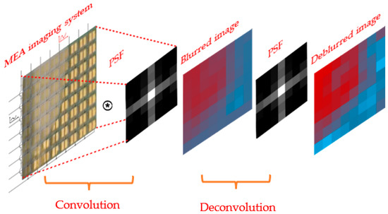 Since those cells located on top of one pair of electrodes create an image point that is blurred by this PSF, the unprocessed image is a convolution of the real distribution of cells with the PSF (see Figure 8). For deblurring, the images were therefore deconvoluted with the PSF as kernel (using MATLAB from The MathWorks, Inc., Natick, MA, USA) as illustrated in Figure 8.