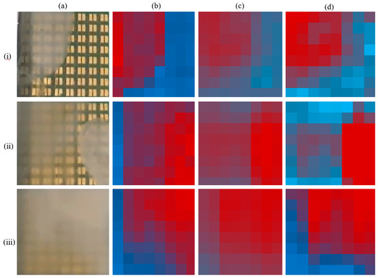 Optical camera images of yeast suspensions with a concentration of 70 g/L dispensed into the reservoir above the MEA to form an inhomogeneous distribution (a). Images converted into 8 × 8 pixel image in which each pixel represents the average light intensity calibrated to cover the full range from red = 0 to blue = 255 (b). Im[Z] images as obtained with impedance camera after background subtraction (stimulation with 200 kHz at −10 mV amplitude) with same color scale for each image (c). Respective Im[Z] images obtained after deblurring (d). Images were obtained one minute after 20 μL solution injected in the upper left corner of the MEA (i), after another 20 μL injected in the lower right corner of the MEA one minute later (ii), and after another 20 μL injected in the upper right corner of the MEA one more minute later (iii). Pixels in (c,d) represent values of the imaginary part of impedance re-calibrated to cover the full scale from red = 0 to blue = 255.
