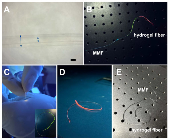 The photographs of the fluorescent hydrogel fiber. (A) The optical microscope photograph of the hydrogel fiber. Scale bar = 0.5 mm. (B) The fluorescence photograph of fluorescent hydrogel fiber excited with 490 nm light. (C,D) Fluorescence photographs of hydrogel fiber underside UV light (365 nm) illumination. (E) Photographs of the fabricated hydrogel fibers.