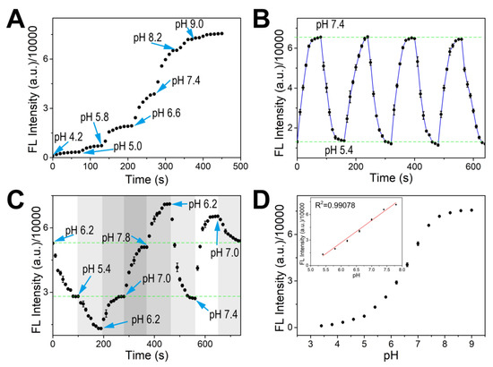 (A) Time response of pH detection from pH 3.4 to pH 9.0. The dots represent the fluorescence intensity recorded every 10 s, which is the same as (B,C). The moments when pH starts to change are pointed out with arrows, which is the same as (C). (B) Repeatability of the sensor for pH detection from pH 5.4 to pH 7.4. The green dashed lines represent reference fluorescence intensity corresponding to pH 7.4 (up) and pH 5.4 (down). (C) Time response of the sensor for continuous pH monitoring (pH 7.0→6.2→5.4→6.2→7→7.8→6.2→7.4→7.0). The green dashed lines represent reference fluorescence intensity corresponding to pH 6.2 (down) and pH 7.0 (up). (D) Detection curve of the sensor for pH. Inset: linear relation of fluorescence intensity to pH. Error bars in (B–D) are based on standard deviations (n = 3).