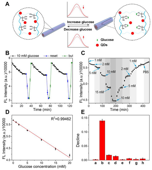 On account of the reversibility of complexation between glucose and PBA, the 3-APBA functionalized hydrogel fiber doped with QDs could be applied in continuous glucose monitoring [59]. Fluorescence intensity followed changes in glucose concentration ranging from 1 mM to 10 mM (Figure 5C). It took ~25 min to reach the equilibrium for each increase in glucose concentration. Fluorescence intensity changed linearly with glucose in the range of 0 to 20 mM (Figure 5D), which covered the physiological glucose concentration range (normal: 4.2–6.4; diabetic: 3.0–20.0). The decomplexation time was ~40 min for each glucose concentration decrease (Figure 5C). When the glucose concentration returned to the same level during the drop in the glucose concentration, fluorescence intensity recovered. No hysteresis occurred in dynamic changes. Thus, the sensor can be used for continuous glucose dynamic monitoring in the long term.