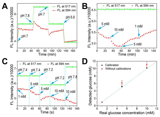 (A) Time response of fluorescence intensity at 517 nm and 594 nm when pH changed in the range of 6.6–7.8 with a fixed glucose concentration of 10 mM. The dots represent the fluorescence intensity recorded every 4 min, which is the same as (B,C). The moments when pH and glucose concentration start to change are pointed out with arrows, which are the same as (B,C). The solid line is for ease of understanding. (B) Time response of fluorescence intensity at 517 nm and 594 nm when glucose concentration changed in the range of 1–10 mM with fixed pH at 7.4. (C) Time response of fluorescence intensity at 517 nm and 594 for cross changes of pH and glucose concentration. The cyan vertical dashed lines play the same role as the arrows. (D) Deviation of glucose detection in (C). The blue dashed line indicates that the detected glucose concentration equals the actual glucose concentration. All error bars are based on standard deviations (n = 3).
