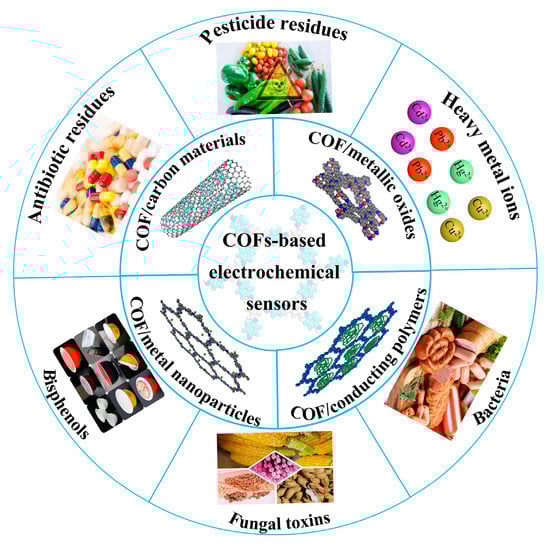 This review aims to present the recent advances of COF-based electrochemical sensors which have been reported regarding their application to food safety analysis (Figure 1). The current synthesis methods of COFs and the strategies to improve their conductivity are discussed below in detail. Then, the sensors used for food contaminant determination, including the linear range, limit of detection (LOD) and real samples, are summarized and compared. Finally, the challenges and future prospects of these electrochemical sensors in food analysis are discussed.