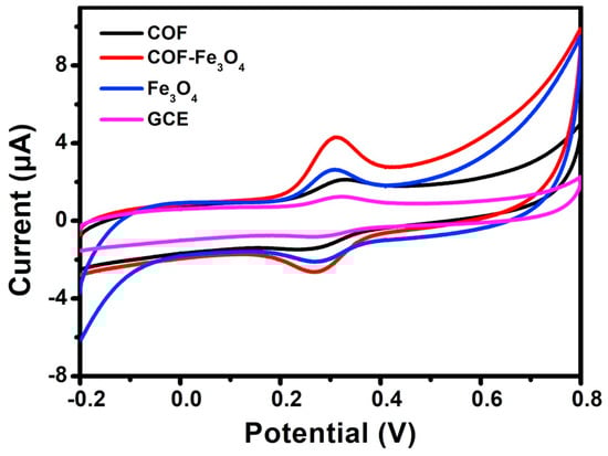 Cyclic voltammograms of Fe3O4 @TAPB-DMTP-COFs/GCE, bare GCE, TAPB-DMTP-COFs/GCE, and Fe3O4/GCE from Ref. [68]. Copyright 2020 Elsevier.
