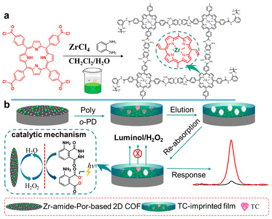 Tetracycline (TC) is a typical antibiotic that can cause resistance and other side effects such as allergic reactions, nephrotoxicity and liver impairment. At present, some electrochemical sensors based on COFs have been used for tetracycline antibiotic detection. For example, Yukun Yang et al. [81] proposed a portable and on-site electrochemical sensor based on surface molecularly imprinted polymer (MIP)-modified magnetic COF (Fe3O4@COFs@MIPs) for the sensitive and rapid determination of TC. The Fe3O4@COFs@MIPs was synthesized according to a layer-by-layer modification method, which showed outstanding adsorption properties and good magnetism. The liner range of the electrochemical sensor for TC determination was 1 × 10−10–1 × 10−4 g/mL and the LOD was 2.4 × 10−11 g/mL (S/N = 3). The prepared sensor has also been successfully applied to milk and chicken samples. Xionghui Ma et al. [82] constructed an MIP electrochemiluminescence sensor based on a novel Zr- amide porphyrin-based 2D COF for TC determination in milk samples (Figure 6). The COF was obtained by a facile liquid–liquid interface method and showed remarkable electrocatalytic performance due to its inherently-ordered structure and abundant Zr catalytic active center. The LOD of the sensor for TC determination was 2.3 × 10−6 μmol/L. In another example, Hongming He et al. [83] synthesized a ferriporphyrin-based COF (Fe-PPOF) by a sonogashira coupling reaction. Then, an electrochemical aptasensor was constructed using aptamer-immobilized Fe-PPOF for oxytetracycline determination with an LOD of 2.05 fg/mL. Moreover, the electrochemical aptasensor has also been applied to the analysis of oxytetracycline in milk samples. Apart from TC, some other electrochemical sensors based on COFs have been reported for the determination of sulfamerazine [84], sulfadiazine [61], furazolidone [85], penicillin [86] and chloramphenicol [87].