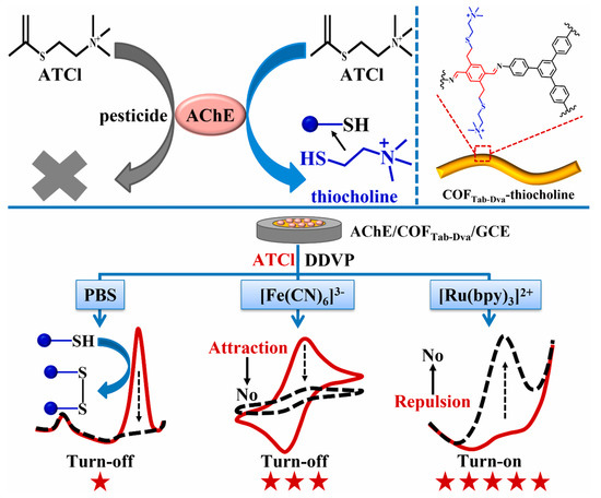 Pesticide residues in food samples have become a great threat to human life. Thus, it is urgent to detect pesticide residues in a sensitive, selective, simple and rapid manner. Carbaryl is a carbamate pesticide that can cause damage to the nervous system and brain [102]. Lili Chen et al. [88] proposed a N, O-rich COF paper constructed-based electrochemical biosensor with repeatability, selectivity and stability for carbaryl detection. The COF was prepared through an aminealdehyde condensation reaction, which had abundant C=O, NH and OH groups. Then, the COF was fixed on a paper electrode to load acetylcholinesterase, which could greatly enhance the bioactivity of acetylcholinesterase. The COF was able to capture thiocholine by hydrogen bonding. The linear range of the biosensor was 0.39–35 μmol/L with an LOD of 0.13 μmol/L. The electrochemical biosensor has also been used for the determination of carbaryl in lettuce juice samples. In a similar example, Shuo Wang et al. [89] designed an MIP electrochemiluminescence sensor, based on COF and carbon nitride nanosheets, which can detect carbaryl sensitively and accurately. Organophosphorus pesticides are organic compound pesticides containing the phosphorus element; they are widely used in agricultural production, resulting in various degrees of residues in crops [103]. Guangran Ma et al. [90] reported a ratiometric electrochemical biosensor based on a COFTab-Dva nanofiber with excellent electroactivity for O, O-dimethyl-O-2, 2-dichlorovinylphosphate (DDVP) determination (Figure 7). COFTab-Dva nanofibers can effectively immobilize acetylcholine and enrich thiocholine due to their large surface area and abundant vinyl. The LOD of the electrochemical biosensors was 0.11 μmol/L. More interestingly, the ratiometric electrochemical biosensor was successfully used to detect the DDVP residual in lettuce juice samples. Xianbo Lu et al. [91] also synthesized a COF with abundant carbonyl groups and used the same to construct an electrochemical sensor for paraoxon determination in cucumber samples. In addition, Xue Wang [92] and Yonggui Song [93] have constructed COF-based electrochemical sensors for the detection of malathion and trichlorfon, respectively.