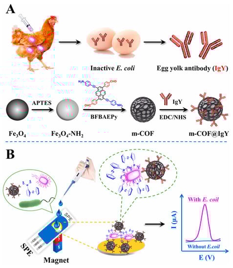 Aflatoxin is a metabolite of aspergillus flavus, aspergillus parasiticus and aspergillus norvegicus, which mainly exists in moldy peanuts, cereals and other foods [105]. Due to the high toxicity and carcinogenicity of aflatoxin, it is necessary to determine it in food. Recently, Yuehong Pang et al. [97] prepared a COF (TpBD) -modified GCE by a reliable in situ growth method. Then, the modified GCE was used as a working electrode for the electrochemical analysis of aflatoxin M1 in milk samples with magnetic separation technology. The proposed electrochemical sensor had a lower LOD of 0.15 ng/mL (S/N = 3) due to the large surface area of the COF. Bacterial contamination has attracted increasing attention because it can cause foodborne diseases. Thus, it is important for human health to use simple and rapid methods to monitor bacterial contamination. Ning Gan et al. [98] developed an electrochemical biosensor based on egg yolk antibody-labeled magnetic COF for the determination of Escherichia coli in milk, beef and shrimp samples (Figure 8). Magnetic COF, due to its large surface area and abundant holes, was used to label egg yolk antibodies so as to achieve the efficient enrichment and detection of E. coli. The linear range of the electrochemical biosensor was 10–108 CFU/mL with the LOD of 3 CFU/mL.