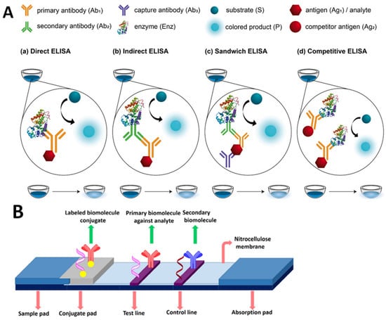 Schematic illustration of an immunoassay method. (A) Various types of ELISA (adapted from Ref. [29]). (B) The basic structure of lateral flow assay, reproduced from Bahadir and Sezgintürk [30].