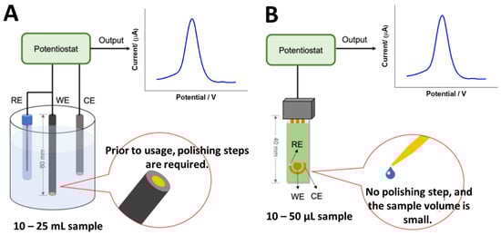 Types of electrode systems that can be used to develop electrochemical DNA biosensors to detect VRE genes. (A) Conventional electrodes and (B) screen-printed electrodes (miniaturized electrodes). This figure has been reproduced from Awang et al. [45], under Attribution 4.0 International (CC BY 4.0) License.