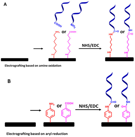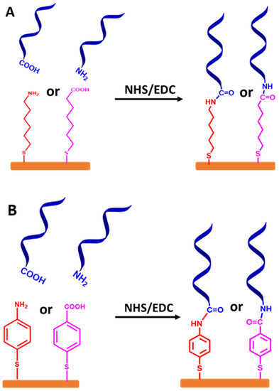 Stepwise protocols based on a spacer from an alkyl chain or aromatic ring are used in different approaches. The ssDNA chains are attached at the terminal end group (tail) via NHS and EDC chemistry, as demonstrated in Figure 8A,B, respectively.