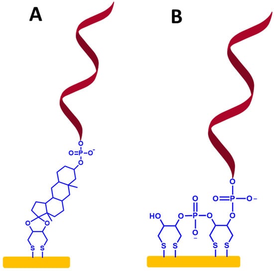 On the other hand, to make more stable immobilized ssDNA probes, previous studies showed that a SAM-based dithiol group has been used for the immobilization of ssDNA probes [50,51,52]. To create this type of ssDNA probe immobilization, the organosulfur molecules that have two identical thiol substituents, can provide two attachment points on the metallic surface, as shown in Figure 9A,B.