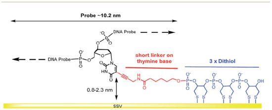 This makes more stable ssDNA probes than immobilized ssDNA probe-based monothiols because of a multivalent mechanism of interactions between the dithiol group and Au surface. Additionally, it provides sufficient distance for an immobilized ssDNA probe, enabling enhanced mobility and flexibility of the ssDNA chains. An exciting work has been demonstrated by Bartlett et al. [51], where 30-mer single-stranded DNA probes were self-assembled on the gold sphere segment void (Au SSV) surface by the three dithiols for monitoring the hybridization of ssDNA to double-stranded DNA (dsDNA) by electrochemically driven melting, as displayed in Figure 10. The primary purpose for using this form of connection at the Au SSV was to prevent ssDNA probe desorption at negative potentials.