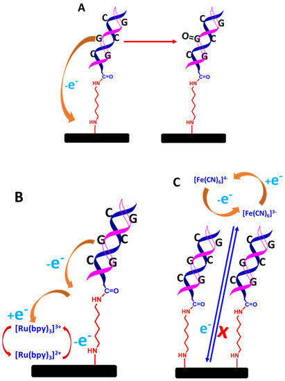 Schematic representation of detecting dsDNA based on label-free electrochemical biosensors; (A) guanine oxidation only, (B) guanine oxidation mediated by ruthenium complex in solution, and (C) blocking effect of ferrocyanide and ferricyanide redox couple [Fe(CN6)]3−/4− in solution. The relative sizes of carbon electrodes, primary amine linkers, dsDNA chains are not to scale.