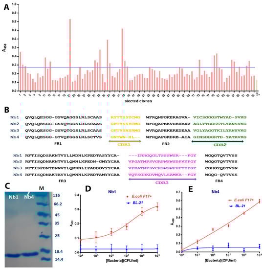 3.1. Library Construction and Selection of F17A-Specific Nanobodies