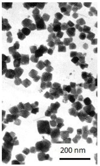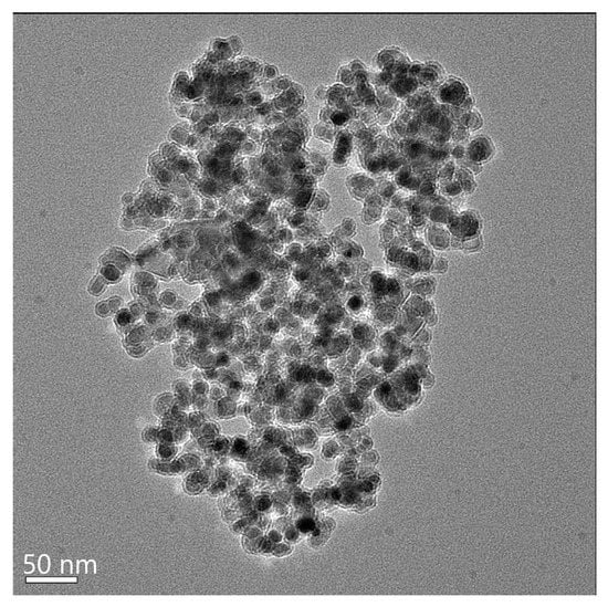 A TEM image of magnetite nanoparticles synthesized via the partial oxidation of ferrous hydroxide is shown in Figure 3. Specifically, the reagent solutions (ferrous sulfate hexahydrate, potassium nitrate, and potassium hydroxide) were mixed quickly and incubated at a temperature of 90 °C for 2 h in a nitrogen atmosphere to avoid the oxidation of the synthesized MNP. After the reaction was completed, the obtained MNPs were washed with water and separated magnetically.