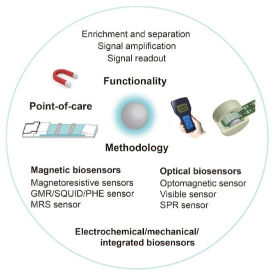 Due to the high selectivity and sensitivity of functionalized MNPs against target molecules and their unique magnetic characteristics, they could be utilized in a variety of diagnostic applications [], i.e., sample preparation, biosensing, and POC diagnostic facilities; therefore, here, we focus on recent advances in this field of science and technology.