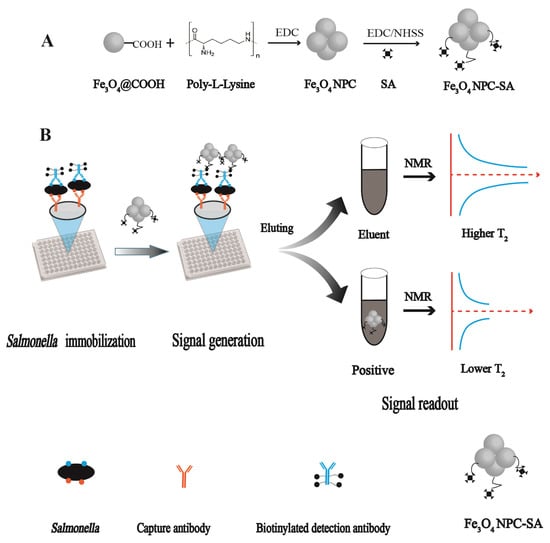 NMR biosensor based on nuclear magnetic resonance for detection of Salmonella: (A) representation for preparation of Fe3O4 nanoparticles (NP) and Fe3O4-streptavidin nanoparticles (NPC-SA); (B) overview of NMR biosensor for detection of Salmonella in milk (reprinted with permission from []).