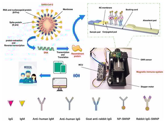 Composition of SARS-CoV-2 virus, the scheme for detection of anti-SARS-CoV-2 immunoglobulin M (IgM) and G (IgG)using the test strip, the magnetic immune system device, and medical applications (reprinted with permission from []).