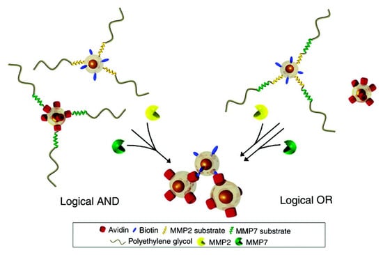 - Von Maltzahn, G.; Harris, T.J.; Park, J.H.; Min, D.-H.; Schmidt, A.J.; Sailor, M.J.; Bhatia, S.N. Nanoparticle self-assembly gated by logical proteolytic triggers. J. Am. Chem. Soc. 2007, 129, 6064–6065. [Google Scholar] [CrossRef]