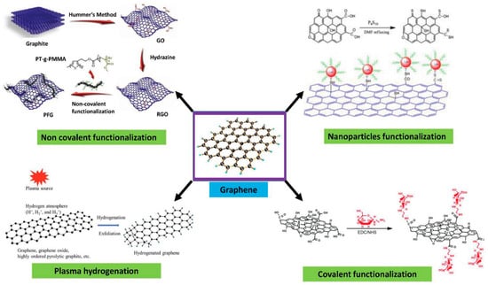 Surface functionalization strategies for graphene-based materials. Reproduced with permission from Ref. [17]. Copyright 2021 Wiley. Licensed under a Creative Commons Attribution (CC BY) License.
