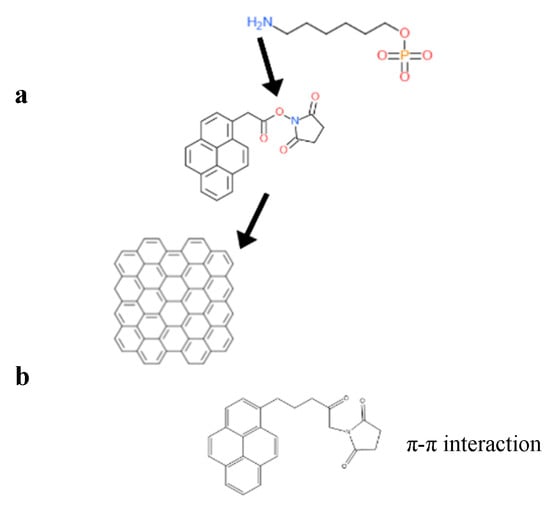In non-covalent surface modification, 1-pyrenebutyric acid N-hydroxysuccinimide ester (PBASE) is often used. Modification through PBASE preserves the electronic properties and planarity of the graphene network without interrupting its sp2 bond in its lattice. In covalent modification, the interruption of electronic properties of graphene has been observed [12]. Hwang T.Y et al. [13] constructed an FET biosensor employing PBASE as linker to capture the desired biorecognition molecule, a probe DNA with an amine group at the 5′ end [10]. PBASE acted as a heterobifunctional linker [12,14], serving two different interactions via its two different moieties. The pyrene moiety in PBASE stacked onto the graphene surface through π–π interactions; meanwhile, the succinimide moiety prefers the amino group at the 5′ end in the probe DNA [15]. The same approach was used to immobilize the aptamer and proteins specific in detecting genome DNA or viral antigens in human serum. For example, amino acid residue on the protein surface binds with PBASE through its ester group. Zhuang Hao et al. [16] employed PBASE to immobilize the cytokine aptamer as the biorecognition unit to design a biosensor for detecting cytokine. Facile passivation methods such as non-covalent modification of the graphene surface are promising techniques which introduce Pi-governed molecules such as PASE. Such non-covalent surface modification can be applied to the surface and would allow linker molecules such as PASE to bind to the surface of graphene through π–π interactions. PASE, due to its heterobifunctional characteristic, helps to bind the biorecognition part such as the probe DNA or antibody through its succinimide moiety. The specificity of the graphene-based sensors, therefore, will be increased by the presence of a biorecognition entity as shown in Figure 3.