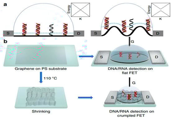 Scheme and characterization of (a) flat and (b) crumpled graphene FET biosensor. Reproduced with permission from Ref. [13]. Copyright 2020 Springer Nature. Licensed under a Creative Commons Attribution (CC BY) License.