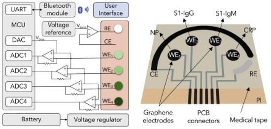 The block diagram and sensor array layout of SARS-CoV-2 RapidPlex are displayed in Figure 9. With the fabricated device, the authors have successfully demonstrated the detection of COVID-19 antibodies from blood and saliva samples wirelessly [15].