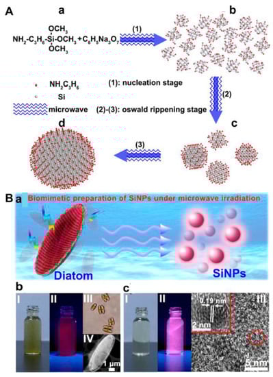 To date, the microwave irradiation (MWI) methodology has been gradually employed for synthesizing various types of silicon nanomaterials, such as nanodots, nanorods and nano-shuttles [39,55,56]. This method possesses three dominant merits in comparison with conventional heating strategies. First, a high reaction rate can be achieved as the sample temperature is rapidly raised. Second, reaction selectivity can be improved under MWI because various substances have different dipole constants. Finally, a rather uniform structure can be formed due to the homogeneous heating induced by microwaves. The most significant potential benefit of the MWI-enabled synthesis of quantum nanodots is the enhancement of photoluminescence intensity without shifting the absorbance/emission spectrum [57]. In 2013, using the MWI method, Zhong et al. adopted APTMS and trisodium citrate (TC) as precursors to synthesize highly photostable SiQDs in aqueous solutions [18]. In brief, the SiQDs were obtained through a nucleation stage and an Ostwald ripening stage (Figure 1A). APTMS (C6H17NO3Si) molecules were reduced by TC (C6H5Na3O7) under MWI, generating crystal nuclei in the first step (step (1)). When the concentration of APTMS molecules decreased to certain degree, the nucleation stage stopped, and the Ostwald ripening stage began (step (2)) and continued (step (3)). Eventually, large-size silicon nanocrystals were formed by the dissolution and absorption of unstable small nanocrystals. Since then, water-soluble SiQDs with good size distribution (2.2–4.22 nm) have been easily synthesized within 25 min via the MWI method (Table 1). In addition, most SiQDs are prepared below 200 °C. Without the deployment of chemical reagents, Wu et al. presented a new biomimetic strategy for the synthesis of SiQDs with a longer emission wavelength (620 nm) under MWI (Figure 1C) [37]. Zhong et al. further applied the ultraviolet (UV) irradiation method to synthesize tunable-color SiQDs in an aqueous phase with a similar process as the MWI method (Figure 1B) [40]. It is noted that the synthesis was performed in glass flasks at room temperature and atmospheric pressure. The quantum yield (QY) and size of SiQDs obtained by the two irradiation methods were alike by using the same silicon source [18,40]. As the QY of SiQDs is in the range of 0.3–47% by the UV and MWI methods, there is still room for improvement in achieving high QY SiQDs. On the other hand, although the two methods are facile and rapid, they have not been widely employed in SiQD preparation. Finally, the applications of these SiQDs are focused on the photoluminescent imaging of cancer cells, C. elegans and zebrafish [18,37,39,40], while there is relatively little work on their applications in biosensing. On the other hand, MWI-enabled synthesis may induce cytotoxicity in the resulting quantum dots [58].