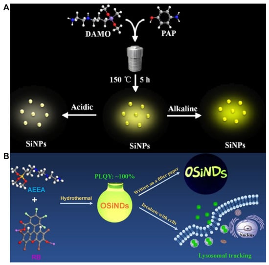 The hydrothermal method refers to a method in which the reaction system is heated to a critical temperature or close to that level in a sealed container with specific solvents as the medium, to generate high pressure and realize inorganic synthesis or material preparation [59]. In general, the hydrothermal method of quantum nanodot synthesis offers the unique advantage of low setup costs, better environmental sustainability and a product with a higher quantum yield [60]. At present, this method has become popular for preparing water-soluble SiQDs. As shown in Table 1, blue to yellow-green emitting SiQDs were facilely obtained by the one-pot hydrothermal method with a temperature range of 150–200 °C. For instance, Na et al. employed DAMO and 4-aminophenol as the reactants for the hydrothermal synthesis of pH-sensitive SiQDs (Figure 2A). The developed sensor can be used to monitor the pH changes in live HepG2 cells [27]. The QY of SiQDs obtained by this method is in the range of 1.6–100% (Table 1). High QY SiQDs can effectively resist the interference of background photoluminescence. Chen et al. synthesized ultrabright water-soluble SiQDs (100% QY) using AEEA and rose bengal (RB) via hydrothermal treatment for 4 h (Figure 2B). The SiQDs were applied to long-time lysosomal imaging in A549 lung cancer cells [48]. The reaction time (2–20 h) of the method is much longer than that of the microwave and UV irradiation methods (within 30 min) (Table 1). Other potential shortcomings of the hydrothermal method for the synthesis of SiQDs include low product yield, low quantum yield and lower stability [61]. Moreover, researchers are prone to using this method for preparing N-doped SiQDs that usually emit blue-to-yellow-green photoluminescence. In 2022, Wei et al. utilized MPTMS as a source of silicon for the synthesis of sulfhydryl-functionalized SiQDs (S-SiQDs) by the hydrothermal method [50]. While the m-phenylenediamine (m-PD) reagent was also used as a precursor that introduced the N element to the final product, the maximum emission of the S-SiQDs (492 nm) was still in the short wavelength region [50].