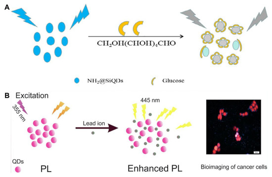 The photoluminescence of SiQDs synthesized via different methods can be directly quenched or enhanced by certain molecules or ions, and turn-off/on biosensors have been developed for the detection of target analytes (e.g., pH [27], Hg2+ [42], CrO72− [45], glucose [67]). Du et al. prepared amino-functionalized SiQDs (NH2@SiQDs) via the microemulsion method by using silicon tetrachloride and allylamine as the respective silicon source and functional group [67]. A non-enzymatic glucose sensor was designed on the principle of the photoluminescent quenching of glucose towards NH2@SiQDs (Figure 4A). The limit of detection (LOD) was determined to be 0.3 μM. The linear response range against glucose was 1–90 μM, which did not cover the glucose level (3.9–6.1 mM) in the blood of a healthy human [76]. Finally, the sensor was used for the determination of glucose in 1% human serum [67]. Shen et al. also synthesized N-doped SiQDs using APTMS, trisodium citrate and urea by the hydrothermal method [42]. The photoluminescence of the N-SiQDs could be rapidly quenched within 30 s in the presence of Hg2+ via static quenching. After the addition of glutathione (GSH) to the Hg2+–N-SiQD system, the photoluminescence was restored within 1 min. This is because GSH competes with N-SiQDs for the capture of Hg2+. The detection limits for Hg2+ and GSH are 24 nM and 55 nM, respectively. The “on-off-on” photoluminescent sensor has been applied to the dual-responsive detection of Hg2+ and biothiols in live MCF-7 cells [42]. MEF occurs when the separation between the fluorophore and metallic surface is about 5–90 nm, facilitating more photons being absorbed by the fluorophore [46]. Golsanamlou et al. prepared amine-functionalized SiQDs for the turn-on detection of Pb2+ based on the MEF effect (Figure 4B). The photoluminescence of the SiQDs increased linearly with the Pb2+ concentration with an LOD down to around 20 ng/mL. The developed nanosensor was utilized for Pb2+ detection in plasma, cell lysate and HT 29 cancer live cells. The synthesis of SiQDs via hydrothermal technique is simple but time-consuming (20 h) [46]. Wei et al. found that the photoluminescence of S-SiQDs was selectively quenched by hypochlorite (ClO) via the oxidization of the sulfhydryl groups of S-SiQDs and static quenching [50]. The reaction could be completed in 10 s. The photoluminescent intensity of S-SiQDs in response to ClO was in a linear range of 0.05–1.8 μM with a detection limit of 13 nM. The S-SiQDs were successfully applied to the imaging of ClO in MCF-7 cells and zebrafish [50].