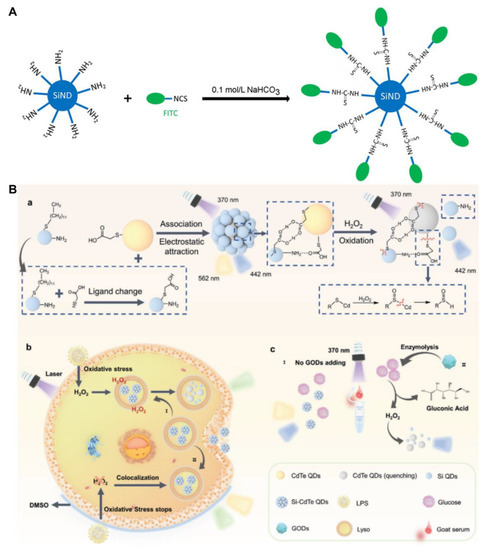 Feng and colleagues used SiQDs and CdTe QDs to prepare dual-emission Si-CdTe QDs for the ratiometric detection of H2O2 and glucose through the FRET mechanism (Figure 5B) [73]. The Si-CdTe QDs were formed via three bonding forces. First, free thioglycolic acid (TGA) in CdTe QDs could replace 1-dodecanethiol on the surface of SiQDs by nucleophilic substitution, generating TGA-capped SiQDs. Then, the SiQDs and CdTe QDs formed an association by their carboxylic acids in TGA caps. Second, the amino groups of SiQDs reacted with the carboxyl groups of CdTe QDs to form ammonium salts. Third, electrostatic adsorption occurred between SiQDs and CdTe QDs with opposite electric charges. The TGA on the surface of Si-CdTe QDs could be oxidized in the presence of H2O2. Then, the FRET between SiQDs and CdTe QDs was interrupted, causing photoluminescent changes. The Si-CdTe QDs exhibited low cytotoxicity stemming from SiQDs, which are fit for photoluminescent imaging of H2O2 in live HeLa cells. Furthermore, with the help of glucose oxidase (GOD), D-glucose can be oxidized to release D-gluconic acid and H2O2. The detection limits for H2O2 and glucose are 79 and 140 nM, respectively. The developed sensor has also been used for ratiometric detection of glucose in goat serum [73]. A photoluminescent GSH sensor based on a MnO2–SiQDs nanocomposite has been developed by Ma et al. [74]. The SiQDs adhere to the surface of the MnO2 nanosheet dominated by electrostatic interactions. The SET from SiQDs to MnO2 induces the photoluminescence of SiQDs to decrease. The MnO2 nanosheets are reduced in the presence of GSH, and the photoluminescence of SiQDs can be restored. The sensor exhibits a detection limit of 153 nM for GSH. It can be applied to directly sense GSH in live BHK cells [74].