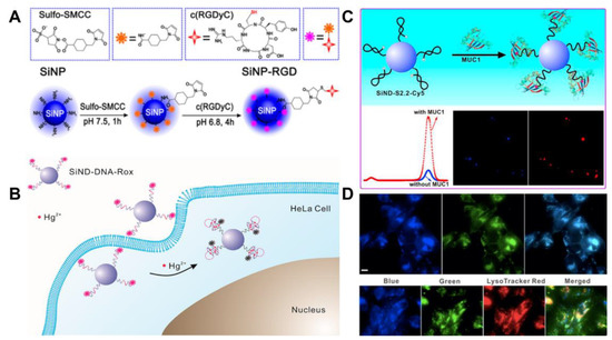 The biomolecular ligands used for the construction of SiQD-based biosensors mainly include DNA [70,71], antibody [78] and peptide [79]. Yanagawa et al. synthesized water-dispersible NIR SiQDs with amino and epoxy groups functionalized on the surface via high-temperature treatment (1100 °C), HF etching and surface functionalization [78]. IgG antibodies are bound covalently to the SiQDs. The luminescence property of the SiQDs is not influenced by the conjugation. Meanwhile, IgG antibodies in IgG-SiQDs retain the binding property with antigen nucleoprotein [78]. The team used a peptide containing arginine–glycine–aspartic acid sequence (c(RGDyC)) to conjugate with amino-terminated SiQDs via a crosslinker 4-(N-maleimidomethyl)cyclohexane-1-carboxylic acid 3-sulfo-N-hydroxysuccinimide ester sodium salt (Sulf-SMCC) (Figure 6A). The SiQDs-RGD exhibited cell specificity to integrin αvβ3-positive U87MG over integrin αvβ3-negative MCF-7 cells. Moreover, the biological sensor possesses efficacious destructiveness to the U87MG cells, suggesting the probability of simultaneous cancer detection and treatment [79].