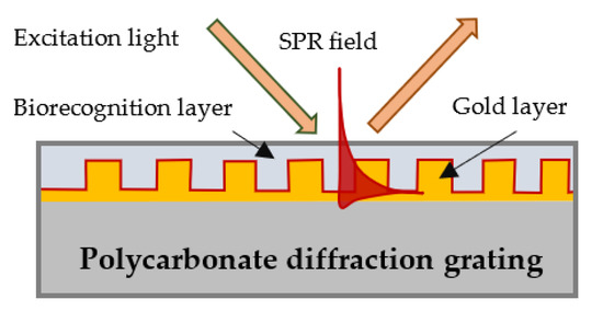In our SPR platform, the plasmon wave was excited on the surface of a gilded diffraction grating, as schematically shown in Figure 1. SPR conditions were fulfilled for a P-polarized light beam that illuminated the grating at an incidence angle of about 35 degrees. Typically, the resonance was excited in the range of 695–705 nm for a bare grating having 80 nm grooves at a distance of 1.55 µm from one another [42]. Our SPR biochip represented the grating covered with a biorecognition layer of mono/polyclonal antibodies of certain thickness, as shown in Figure 1.