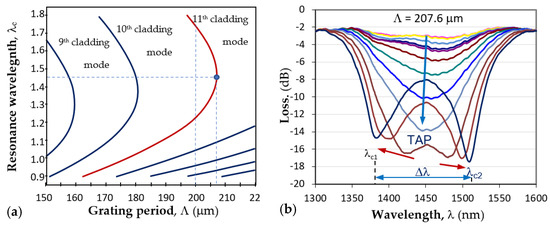 The point where λc1 = λc2 is noted in Figure 4a as the turn-around point (TAP), to which corresponds a definite grating period Λ0p for mode LP0p. For the 11th cladding mode LP0,11 of the photosensitive fiber PS1250/1500 (Fibercore), Λ0,11 ≈ 207.7μm. Figure 4b shows the evolution of the LPG spectrum with period Λ at the turning point. The spectrum deepened and split as either temperature or surrounding refractive index increased, which leads to the increase in the spectral separation Δλ = λc2 − λc1. The change in Δλ with SRI provides the basis for label-free biosensors.