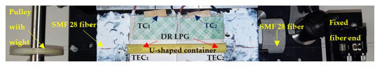 Experimental jig: the DR LPG spliced between two SMF 28 fibers was placed in a U-shaped container (yellow), which was placed on two thermoelectric coolers, TEC1 and TEC2, mounted on a heat sink covered with thermoconductive paste (white) and upon which were fixed two thermocouples, TC1 and TC2.