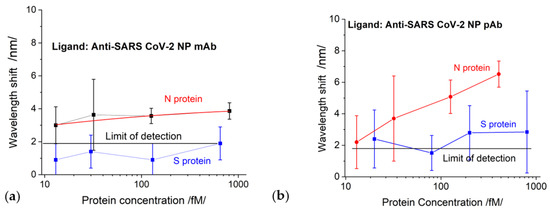 S-protein binding to pAb generated a signal slightly above the detection limit but within the measurement error zone, as shown in Figure 8b. The N-protein detection by pAb (red curve in Figure 8b) was better expressed than the detection by mAb; however, the LOD was the same: 126 fmol.